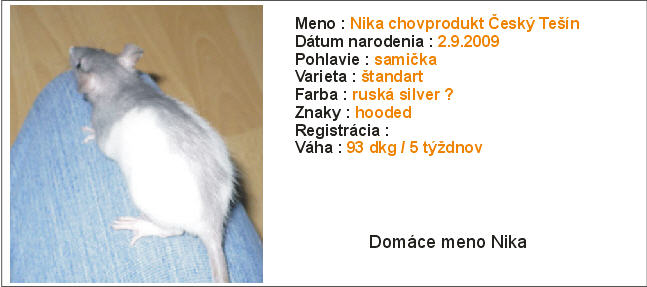 Dnes 15.apríla 2012 ma opustila Nevi. Odišla vo veku dvoch rokov bez pár dní. Už pred pár dňami začala chradnúť, rapídne klesala na váhe a dnes v noci potichúčky odišla. Večer sme sa ešte maznali a škrabkali, spapala krémik a uložila sa do hamáčika. Veľmi veľa sme spolu za ten krátky čas spolu prežili, Bola to veľmi milá a rozumná baba, myslím že je to poznať aj z jej pohľadu na fotke.